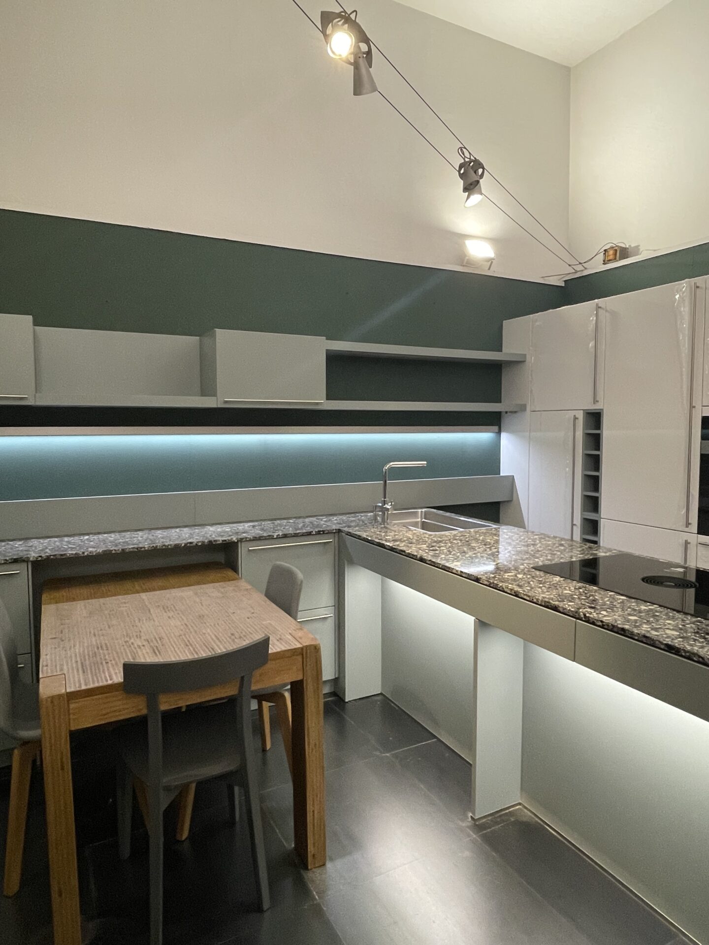 Le mensole sospese e l’illuminazione LED continua integrata sotto i pensili assicurano un effetto luminoso scenografico ma anche funzionale, ideale per la preparazione dei cibi e per valorizzare la profondità della composizione.