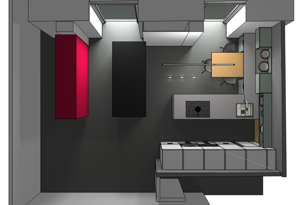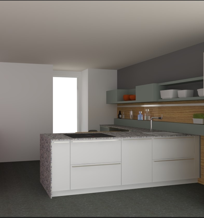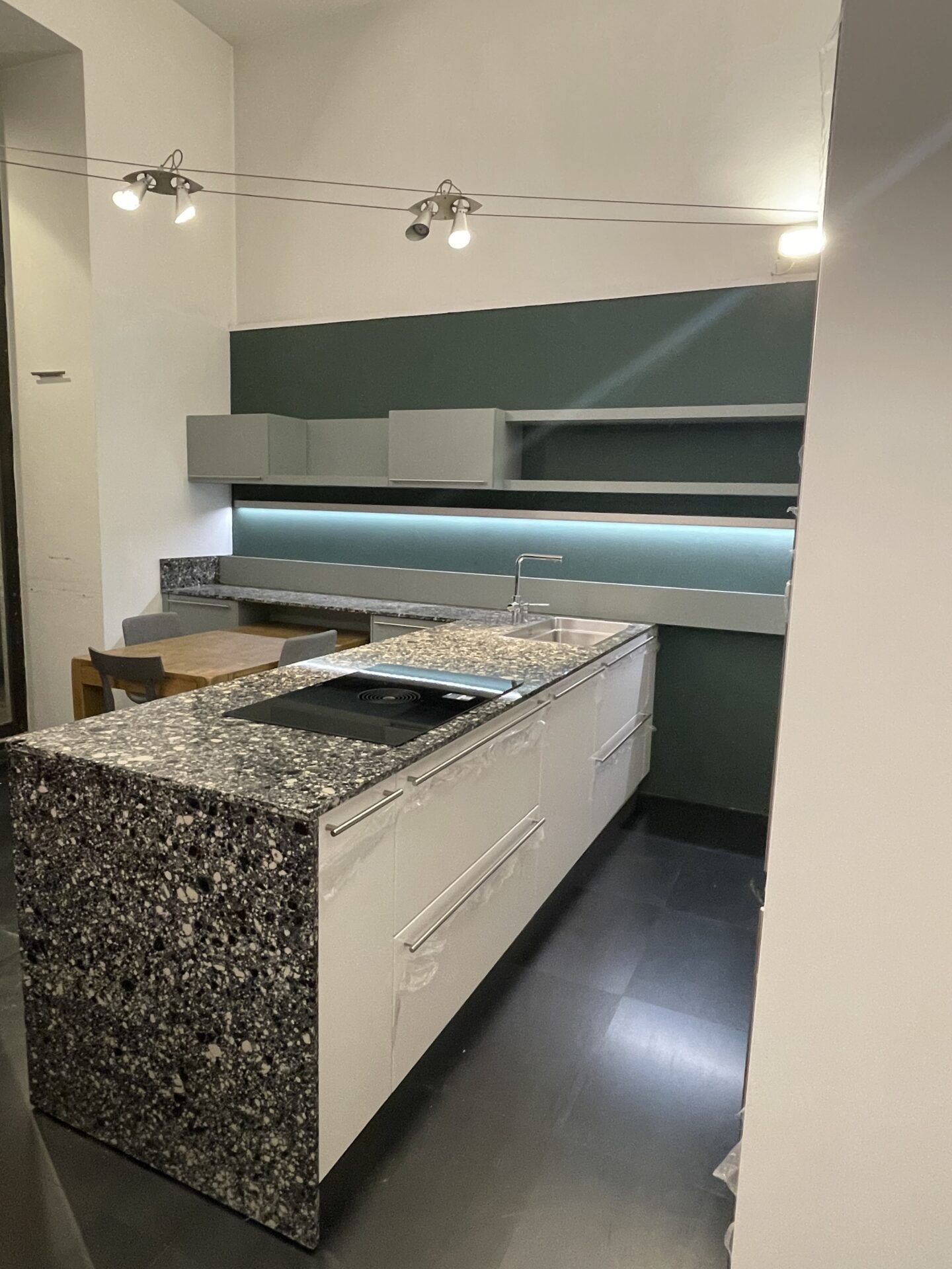 Il contrasto con il top in gres grigio dona un tocco tecnico e sofisticato. Il gres, noto per la sua resistenza a graffi, calore e agenti chimici, rappresenta una scelta ideale per chi desidera una superficie durevole e di facile manutenzione.